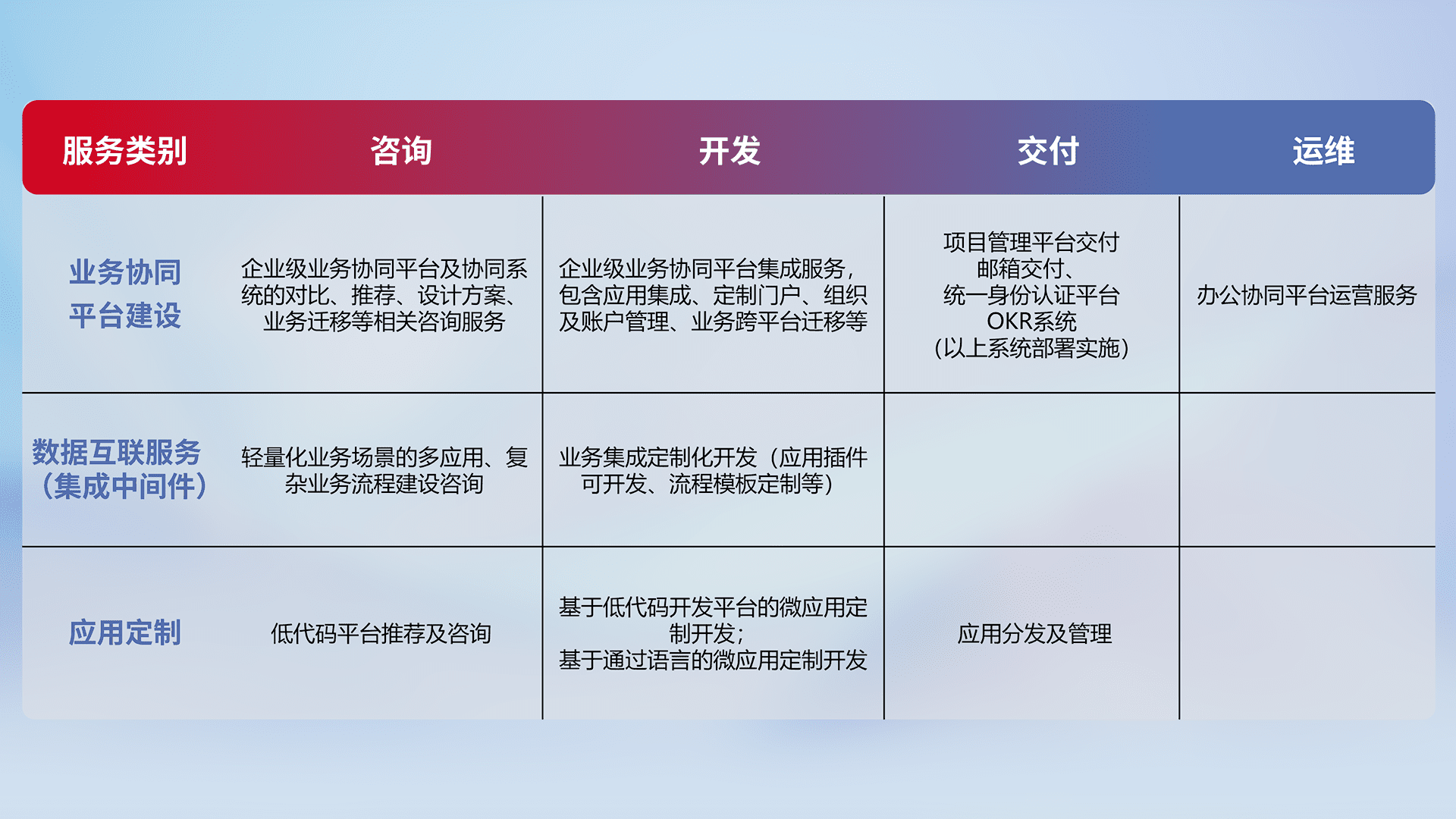 针对钉钉、、、企微、、、IDaas等平台级产品提供产品的规划、、方案、、、交付、、、定制化开发等服务,,实现如统一协同办公、、智能客户服务、、、混合会议管理、、智能数据查询、、、、等业务场景,,,,实现数字化转型。。